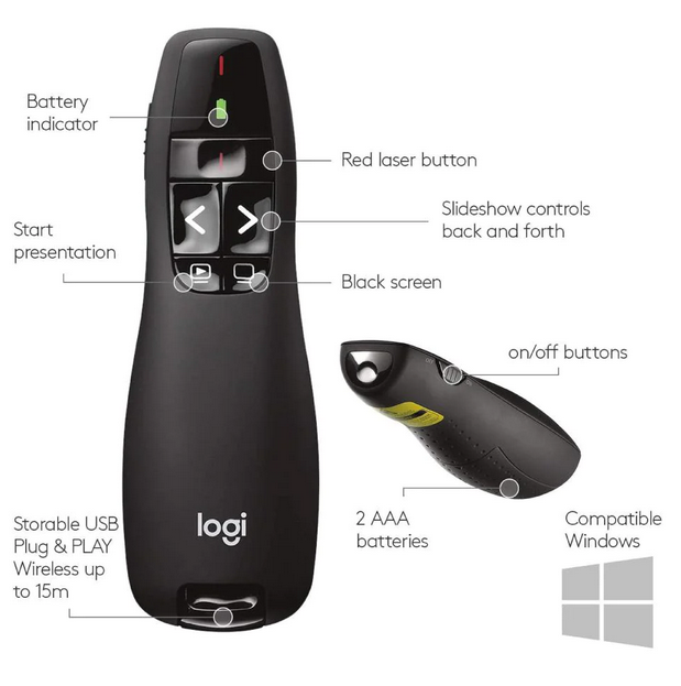 This thoughtful design ensures the Logitech R400 Wireless Presenter fits easily into laptop bags or presentation kits.