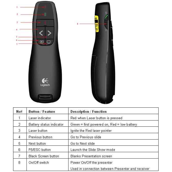 The Logitech R400 Wireless Presenter features essential controls designed for ease of use: