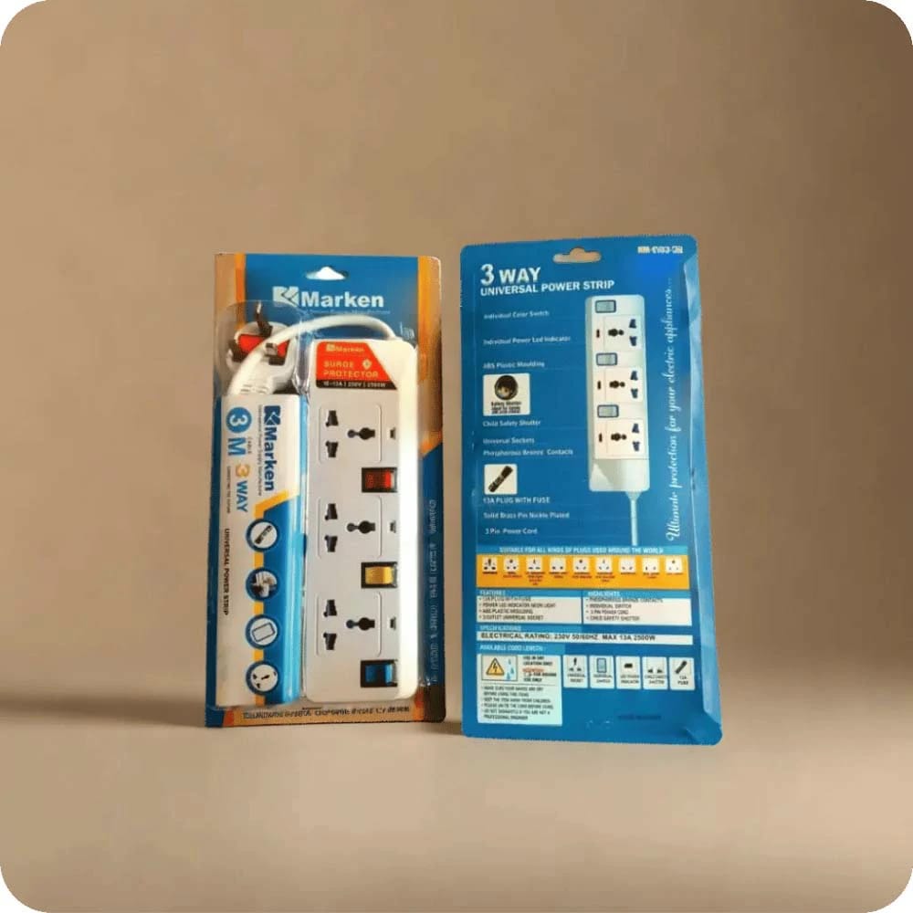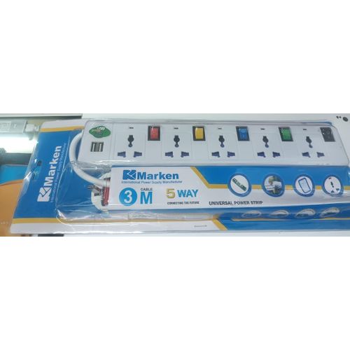 The Marken 5 Way Extension Power Cord is a multi-outlet power strip engineered to distribute electrical power safely and efficiently. It is designed to operate on standard 220–250V AC electrical systems, making it suitable for a wide range of regions and applications. By combining five universal sockets into one compact unit, the Marken 5 Way Extension Power Cord helps reduce clutter and improves accessibility to power outlets.